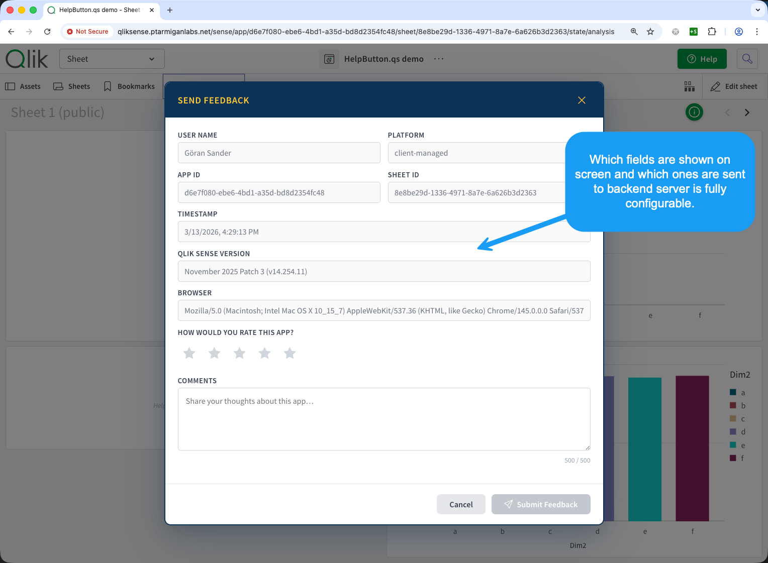 The dialog automatically captures Qlik Sense context alongside the rating: user ID, app ID, sheet ID, platform, and timestamp. You control which context fields are included in the payload and which are shown in the dialog.