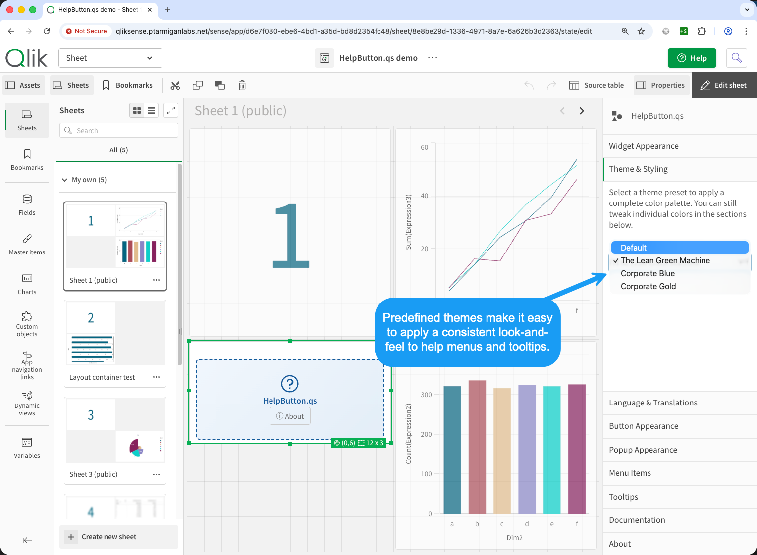 HelpButton.qs 2.1 adds a feedback dialog with star ratings, configurable tooltips for any Qlik Sense object, a theming system with built-in presets, and full translation support for 9 languages. Available for both Cloud and client-managed.