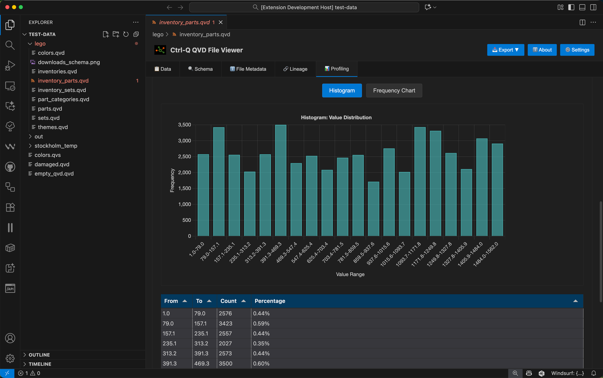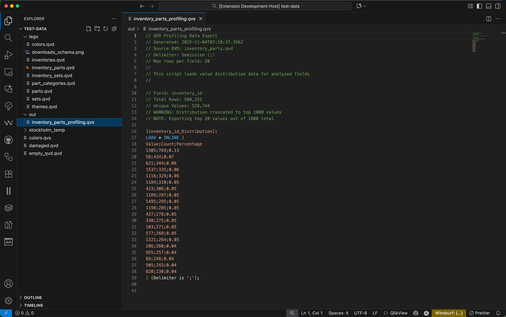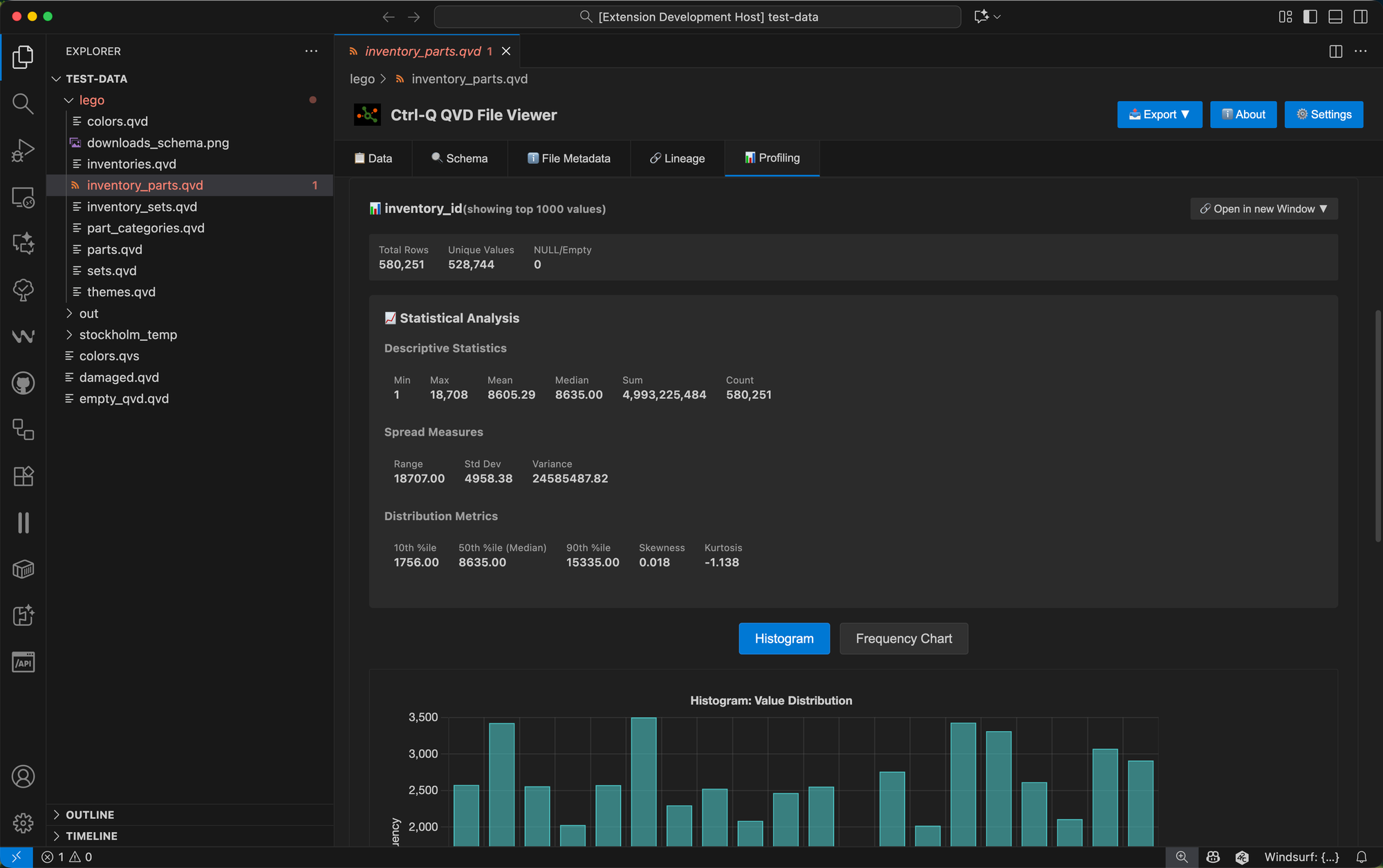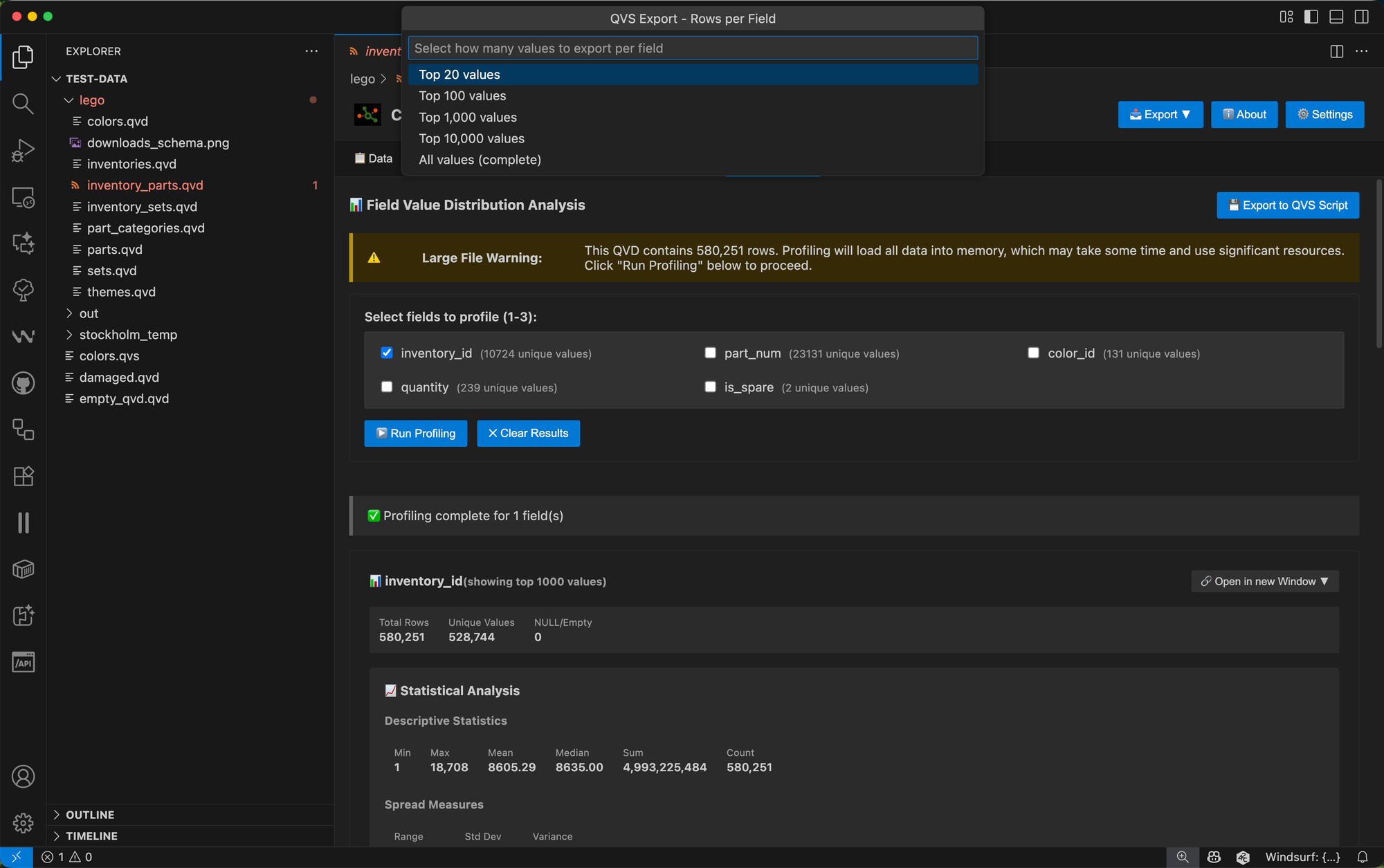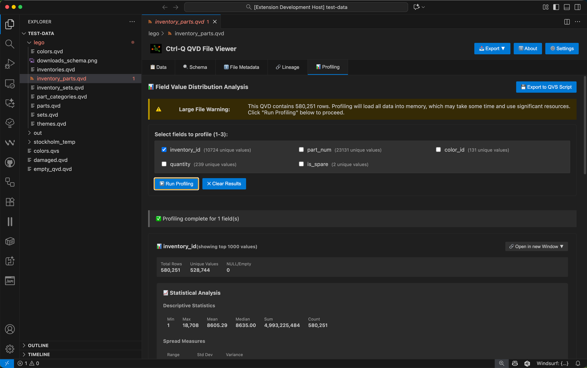 Analyze QVD field distributions directly in VS Code with Ctrl-Q QVD Viewer's new profiling feature. Get interactive charts, statistical analysis, histograms for numeric fields, and export results as Qlik .qvs scripts