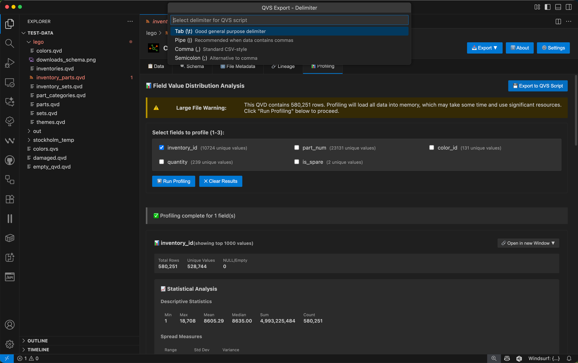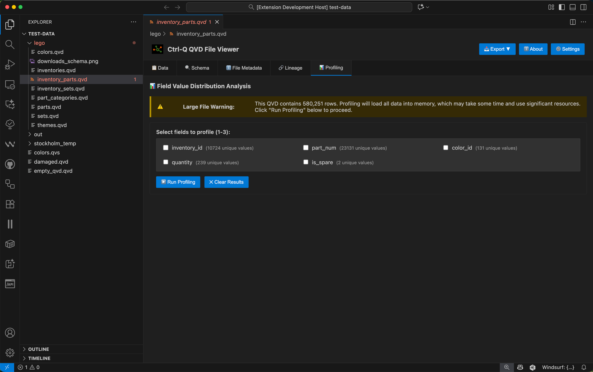 For large QVD files (more than 100,000 rows), you'll receive a warning before profiling begins. This is because profiling loads all data into memory to compute accurate distributions, so it's good to be aware of potential performance impacts.